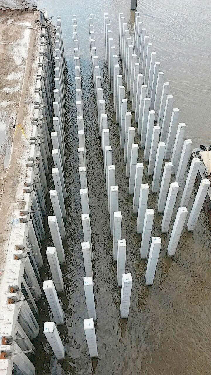 Palen werden geheid vanaf ponton bij een (door getij) sterk wisselende waterstand. (Verschil tussen hoog- en laagtij max 8 meter)